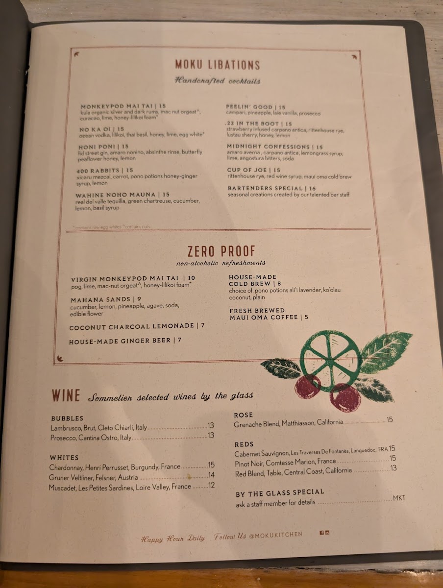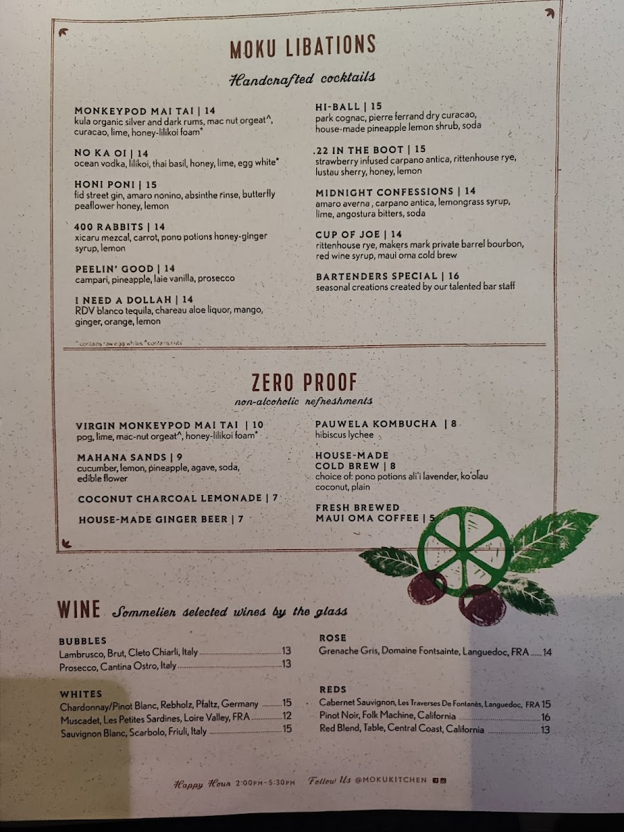 Not to be overlooked is the service at Moku Kitchen, which has consistently received high praise from guests. Attentive and friendly, servers like Grace and Christian make sure each visitor feels welcomed and valued, often providing thoughtful recommendations that elevate the dining experience. Patrons have appreciated the warmth of the staff, who ensure that no one feels rushed, allowing for moments of shared laughter and delicious dining long after the last sip of that heavenly Mai Tai.
